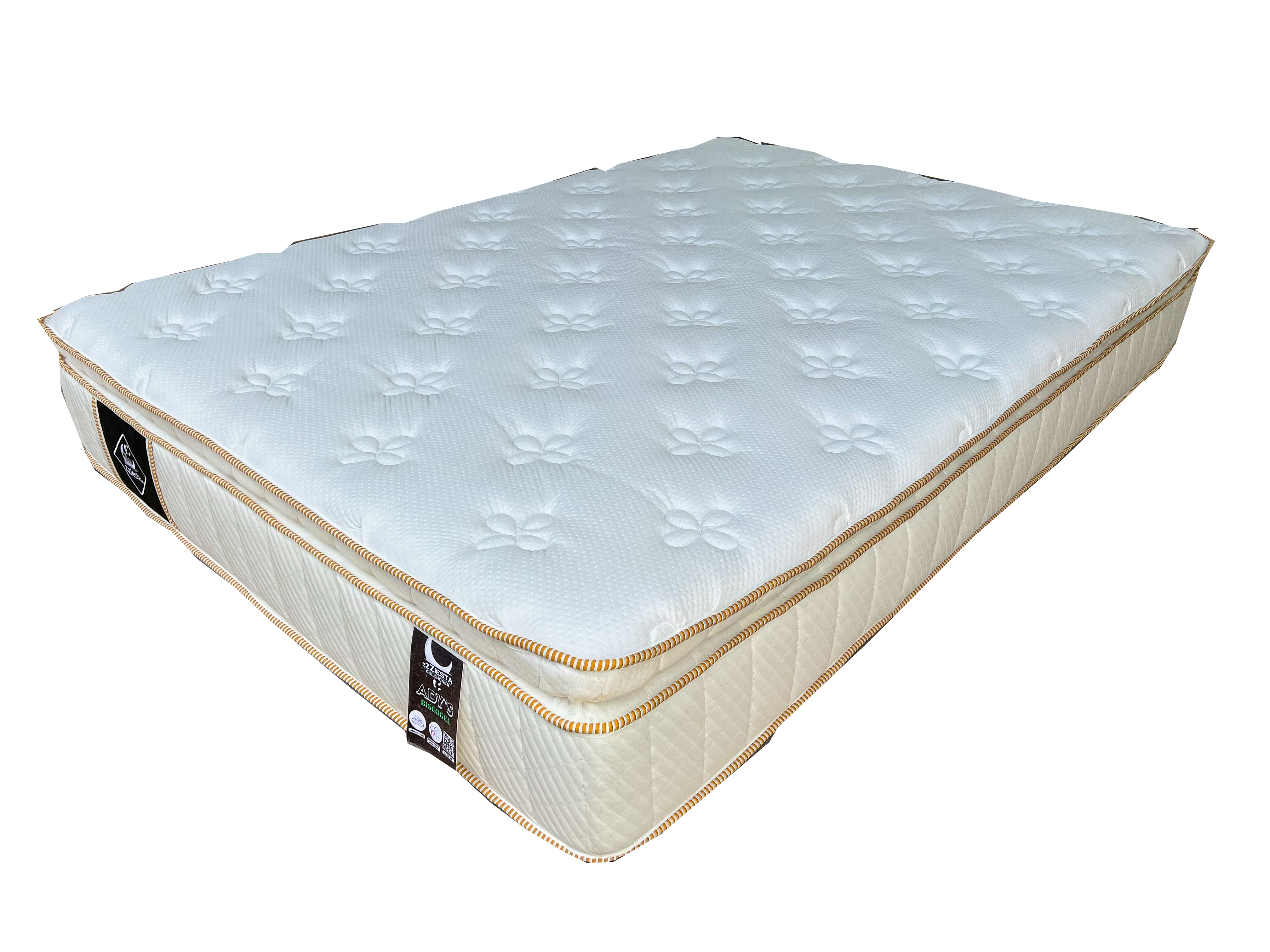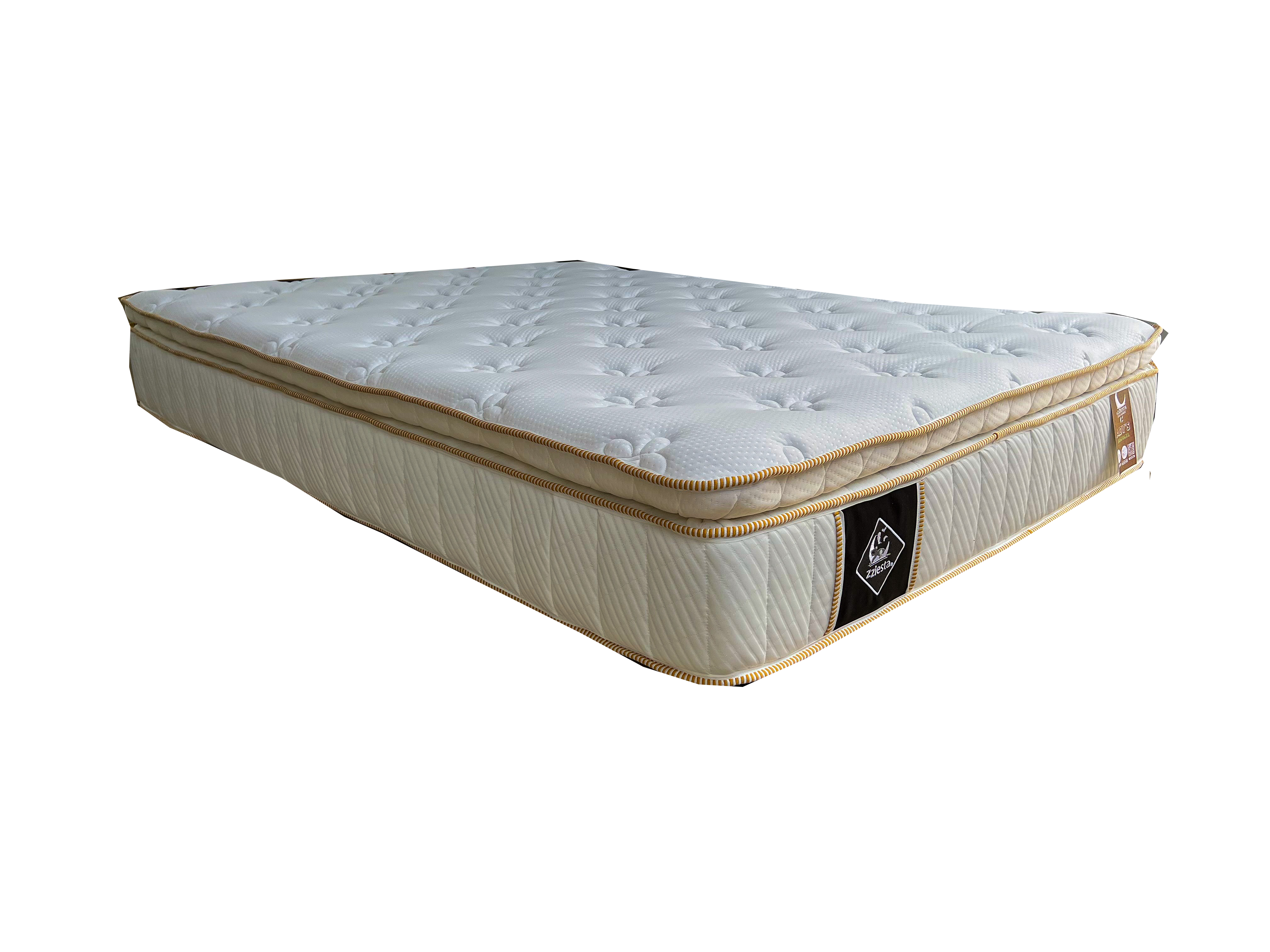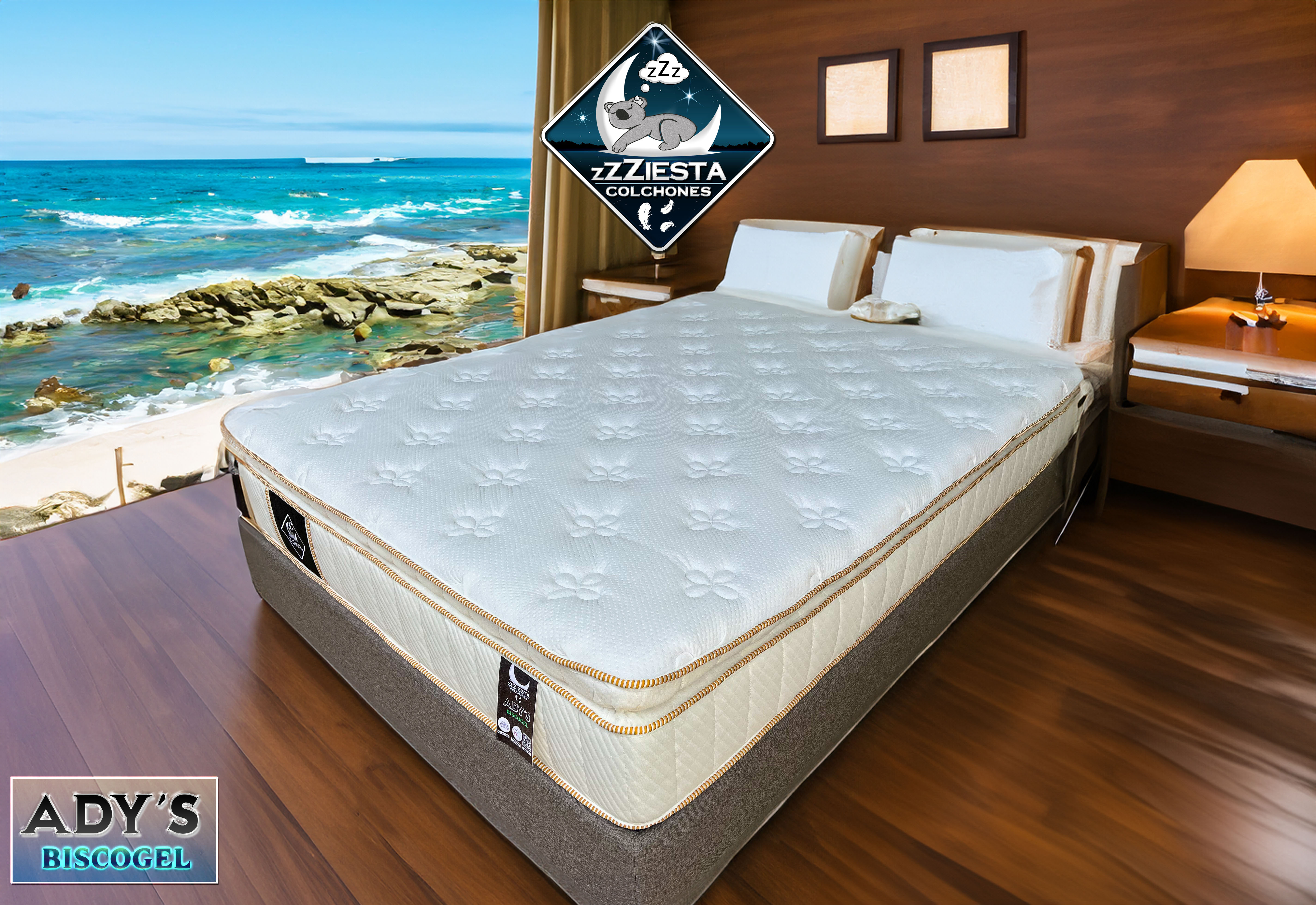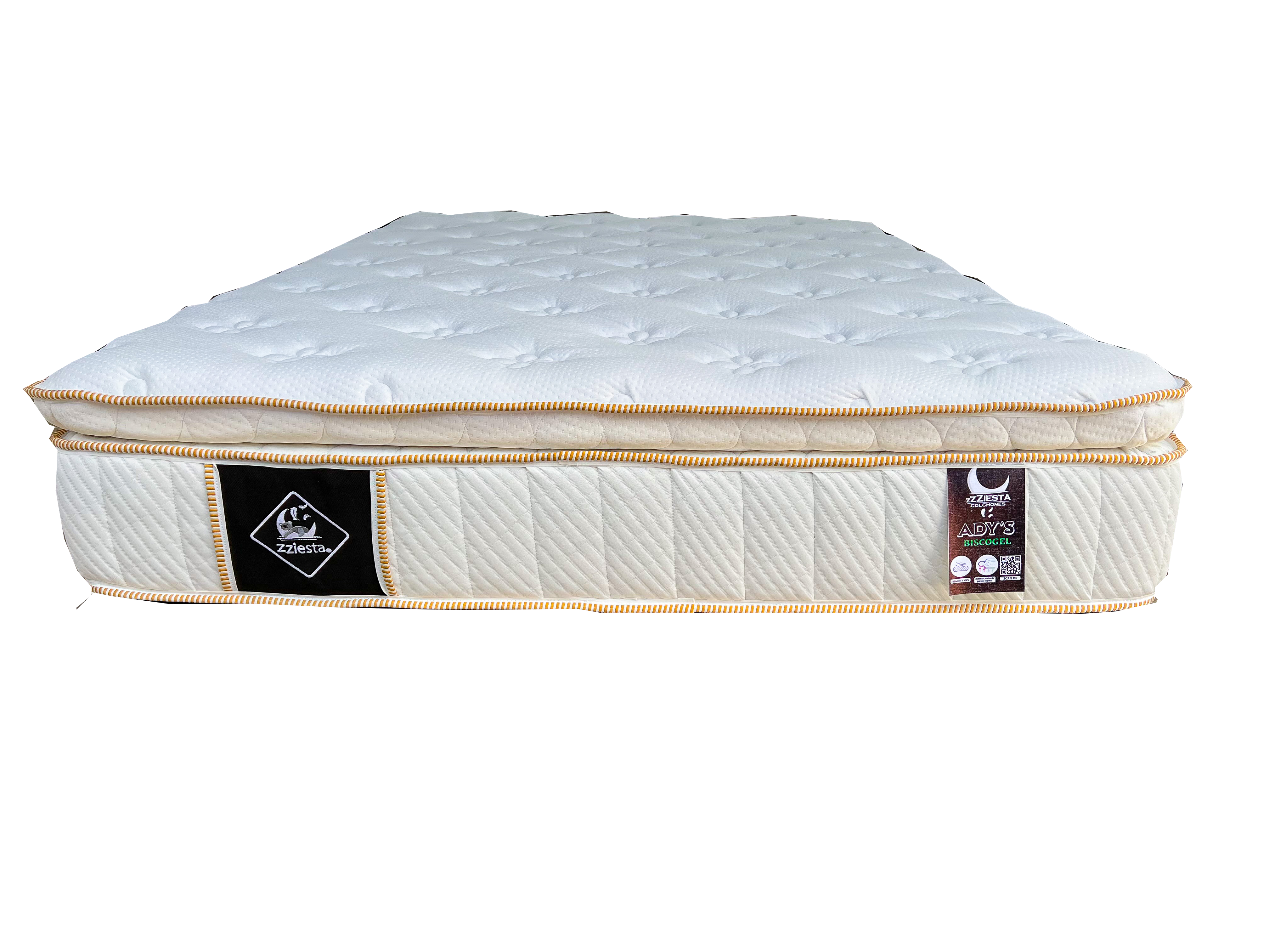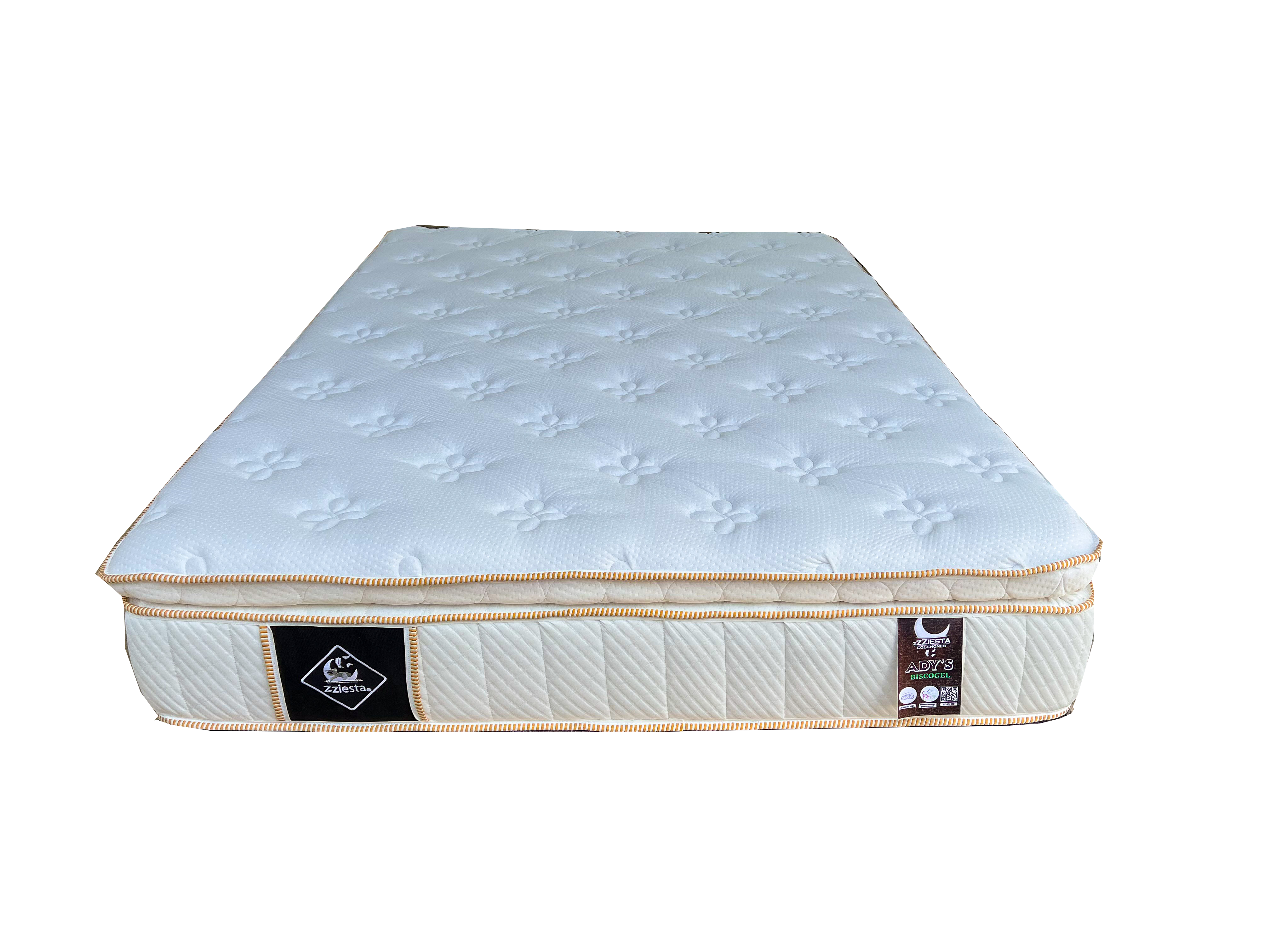 Colchón sin resortes, hecho con núcleo de aglutinado (espuma de poliuterano) de diferentes densidades que evita transmitir movimientos.